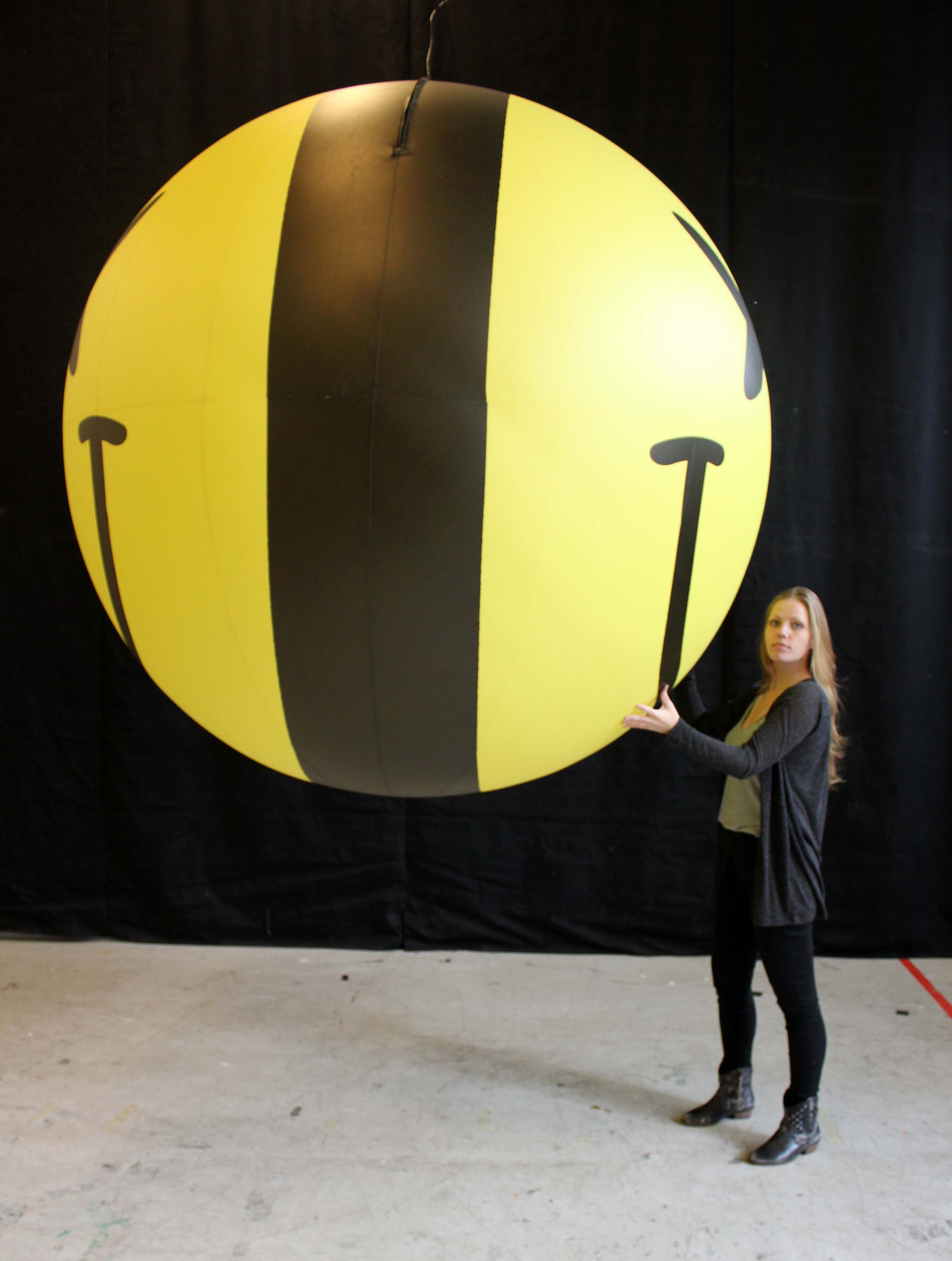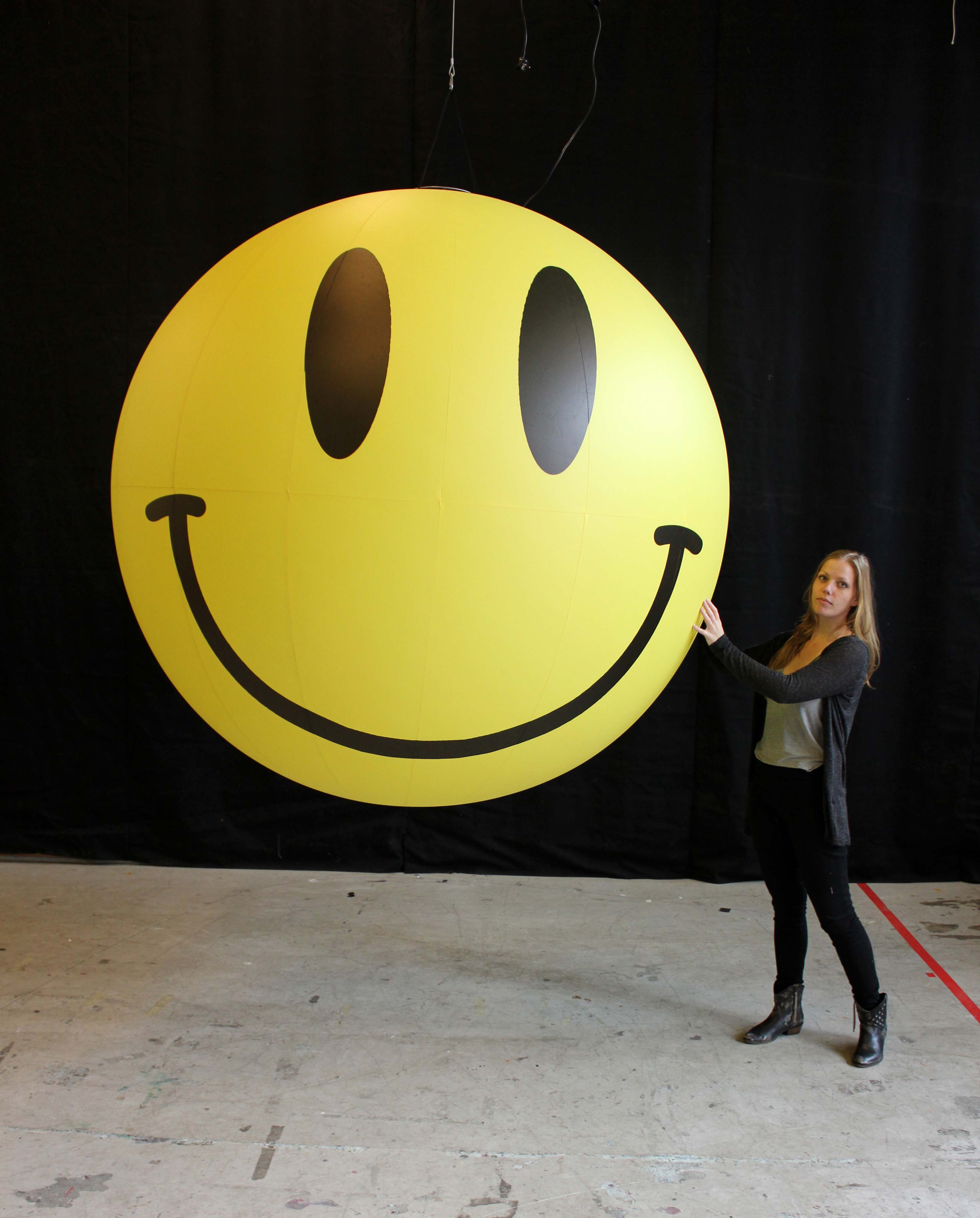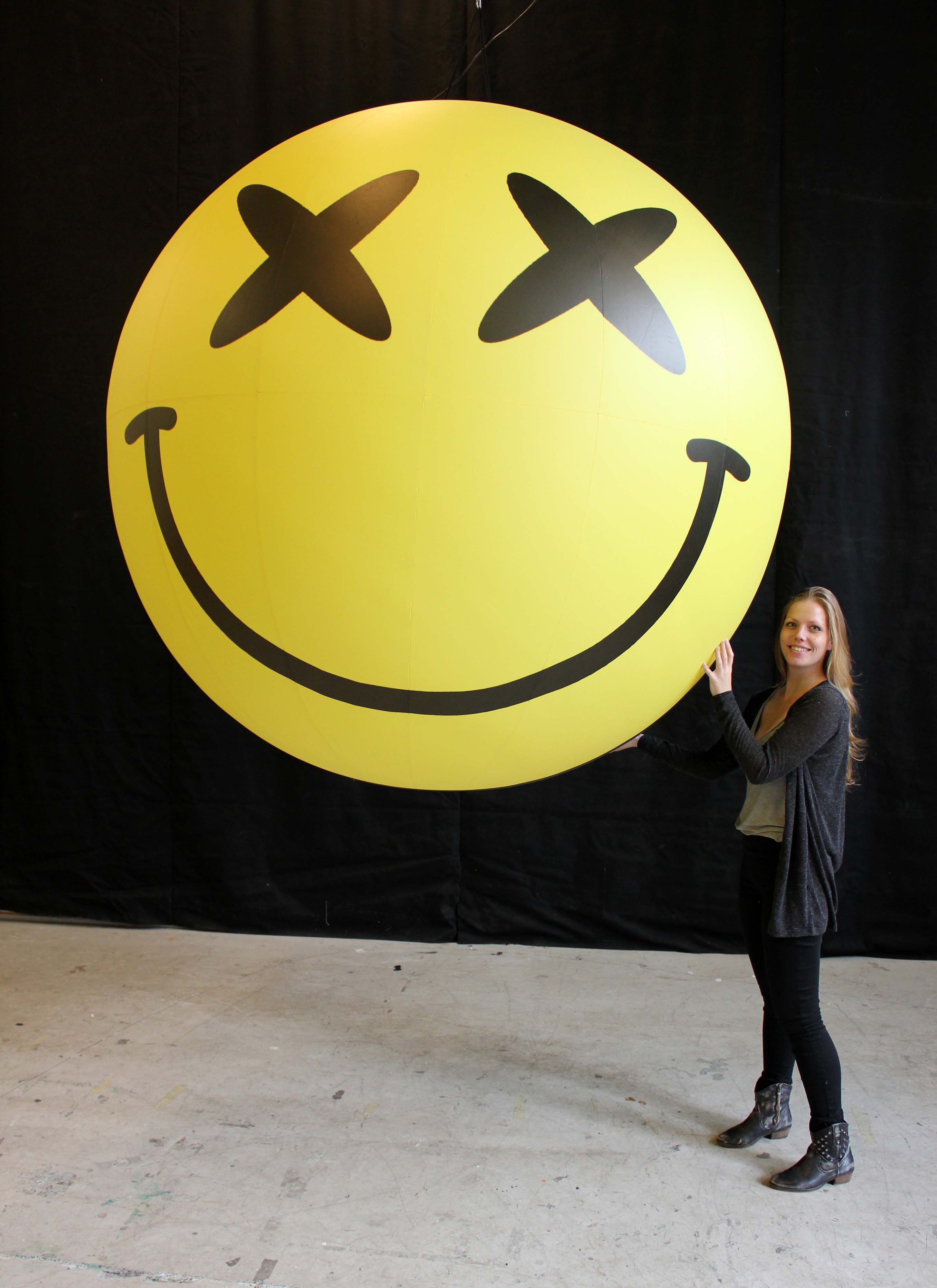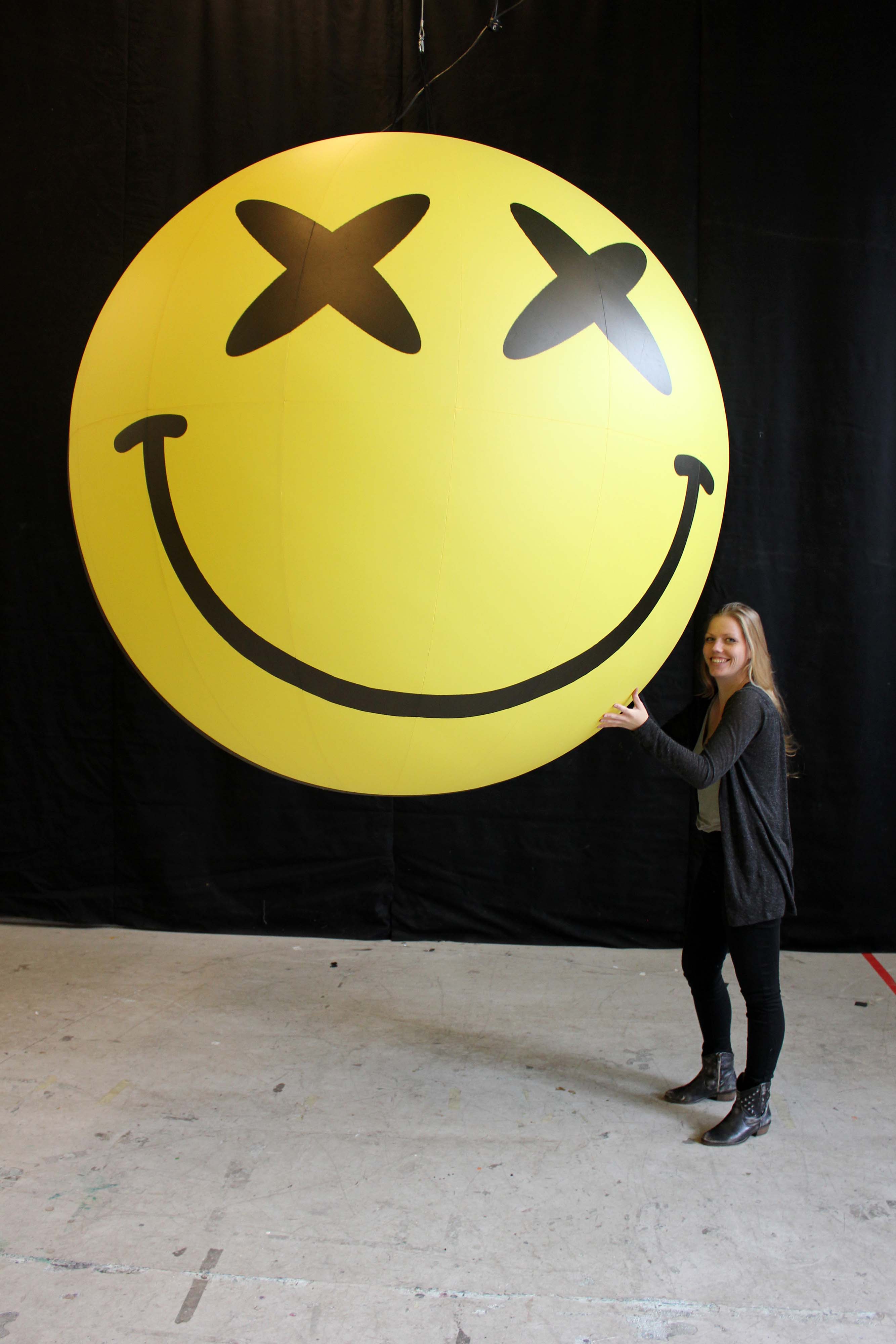2m smiley face ball bliss eyes in Airworks Rentals workshop with a person beside